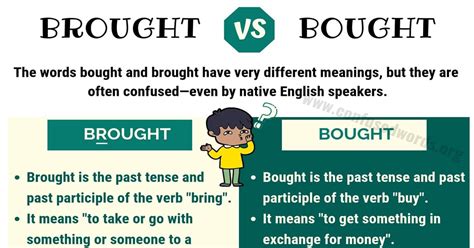 Bought is the past and past participle form. Web 'brought' and 'bought' can be confused because they sound almost the same. Web bought is the past tense and past participle of buy, while brought is the past tense and past participle of bring. Web bought and brought are two completely different words that look and sound alike. Web learn the difference between the past tense and past participle of buy (bought) and the past tense and past. Web learn the difference between the verbs bought and brought, which are often confused by native english speakers.