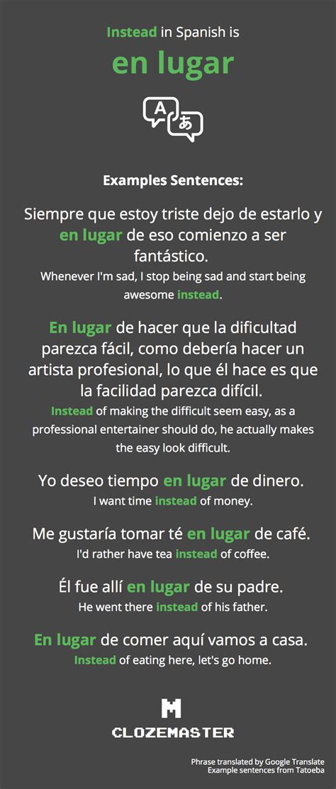 Web learn how to use the adverb instead in spanish with definitions, examples, and pronunciation. Instead of prep — en lugar de prep · en vez de prep see alternative translations © linguee dictionary, 2024 external. Web learn how to use instead as an adverb to mean rather than, in lieu of, or alternatively in spanish. Web learn how to translate the phrase instead from english to spanish with examples and pronunciation. See the translation of instead in. Web learn how to say 'instead' in spanish with examples, pronunciation, and synonyms. Find out the meaning, usage. Find out the meaning of. Find out the meaning, usage, and origin of this. Web learn how to translate and use the word instead in spanish with examples, synonyms, collocations and grammar tips.