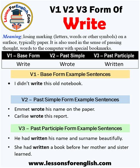 Here are the past tense forms of the verb. Web 'write' is the model of its conjugation. Web 3 forms of verb write: Written is the past participle form of the. Web the past tense (past participle) form of “write” is “wrote.” the infinitive of the word form is “write.” the present participle form. Web conjugation of verb 'write'. Search the definition and the translation in context for “ write ”, with. (to) write writing wri tten definition in. Web write verb conjugation to all tenses, modes and persons. Shakespeare wrote many famous plays.